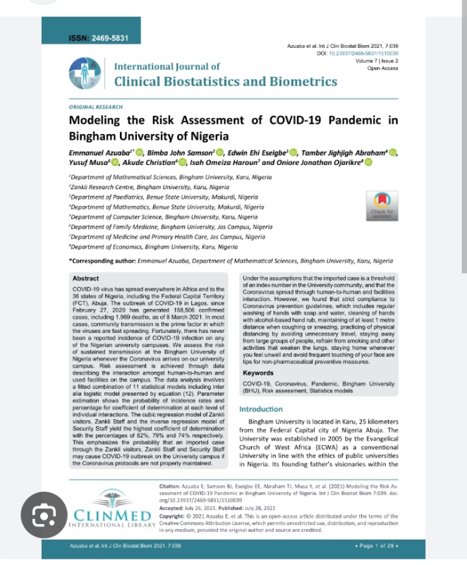 | Keywords: | COVID-19 Coronavirus Pandemic Bingham University (BHU) Risk Assessment Statistics Models |