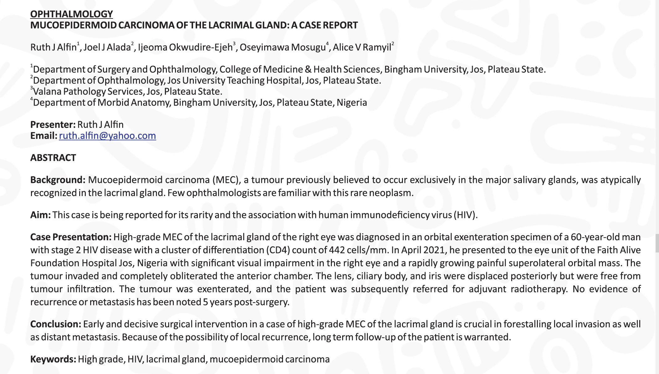 Abstract: Background: Mucoepidermoid carcinoma (MEC), a tumour previously believed to occur exclusively in the major salivary glands, was atypically recognized in the lacrimal gland. Few ophthalmologists are familiar with this rare neoplasm. Aim: This case is being reported for its rarity and the association with human immunodeficiency virus (HIV). Case Presentation: High-grade MEC of the lacrimal gland of the right eye was diagnosed in an orbital exenteration specimen of a 60-year-old man with stage 2 HIV disease with a cluster of differentiation (CD4) count of 442 cells/mm. In April 2021, he presented to the eye unit of the Faith Alive Foundation Hospital Jos, Nigeria with significant visual impairment in the right eye and a rapidly growing painful superolateral orbital mass. The tumour invaded and completely obliterated the anterior chamber. The lens, ciliary body, and iris were displaced posteriorly but were free from tumour infiltration. The tumour was exenterated, and the patient was subsequently referred for adjuvant radiotherapy. No evidence of recurrence or metastasis has been noted 5 years post-surgery. Conclusion: Early and decisive surgical intervention in a case of high-grade MEC of the lacrimal gland is crucial in forestalling local invasion as well as distant metastasis. Because of the possibility of local recurrence, long term follow-up of the patient is warranted.
