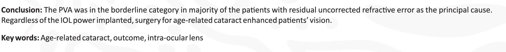 Conclusion: The PVA was in the borderline category in majority of the patients with residual uncorrected refractive error as the principal cause. Regardless of the IOL power implanted, surgery for age-related cataract enhanced patients’ vision.